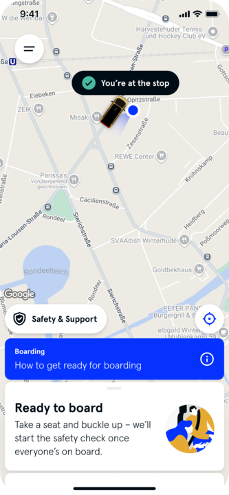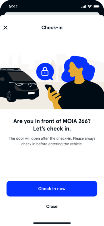 - Once you are at the pick-up point and see your MOIA, you will be notified in the MOIA app when the vehicle is ready for boarding